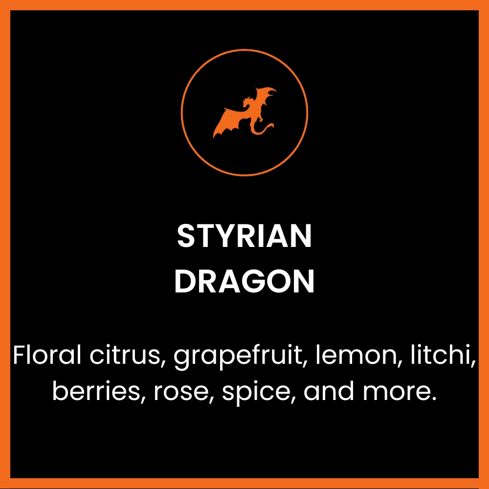 Styrian Dragon is a wonderful aroma hop variety from Solvenia with citrus and tropical aromas. It was bred at the Slovenian Institute of Hop Research and Brewing in Žalec from European and American germplasm. It is a new aroma hop variety with profile descriptions including floral citrus, grapefruit, lemon, litchi, tropical fruit, berries, rose, and spice. Works well with all hop-forward beers including American, Belgian, and British styles, especially modern IPAs.