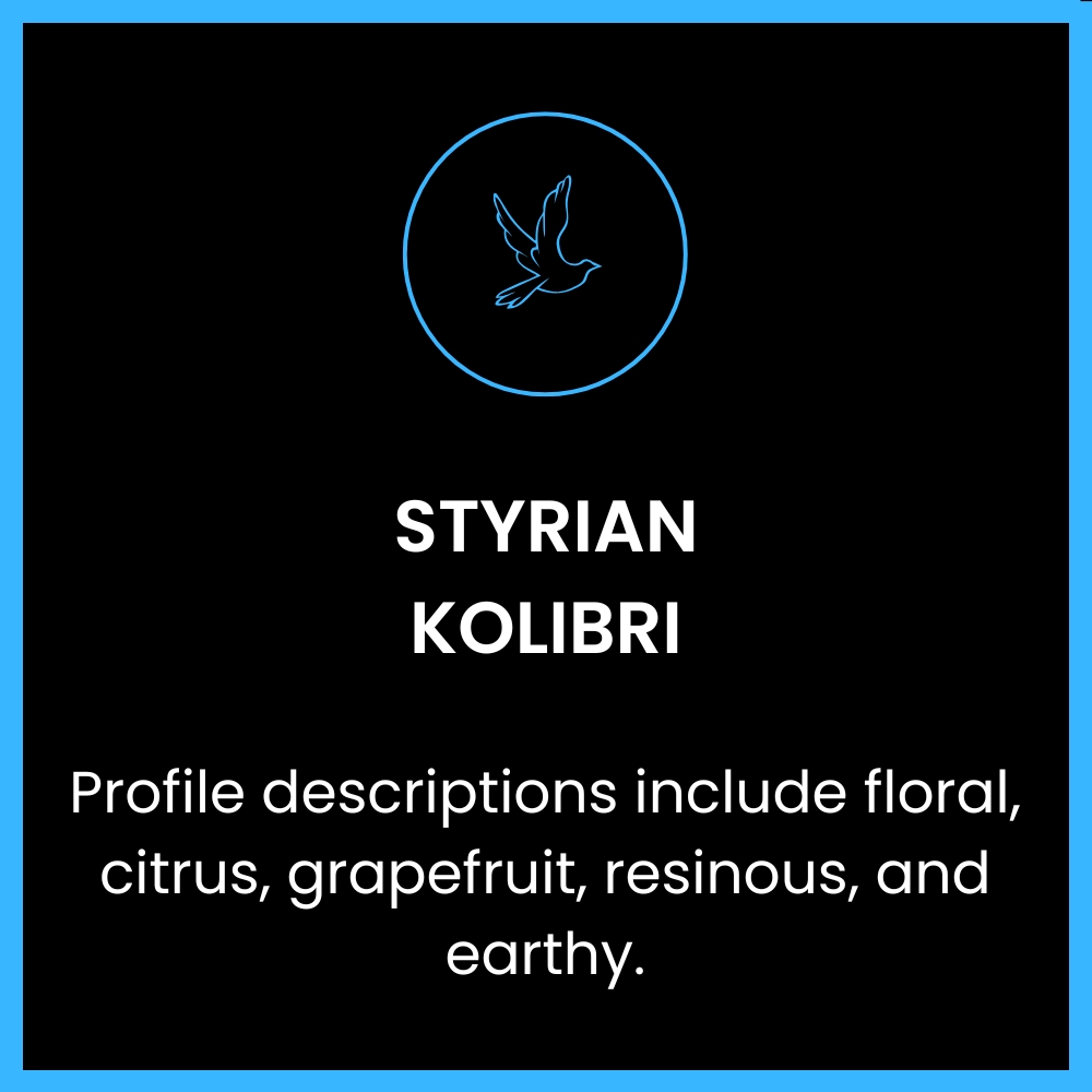 Styrian Kolibri bred was at the Slovenian Institute of Hop Research and Brewing in Žalec from European and American germplasm. It is a new aroma variety with low alpha acids content. Profile descriptions include blackcurrant, blueberry, pineapple, straw, and cannabis. This subtle hop works well with classic European styles, especially pilsner and Kölsch, and English styles, but also with hop-forward beers.