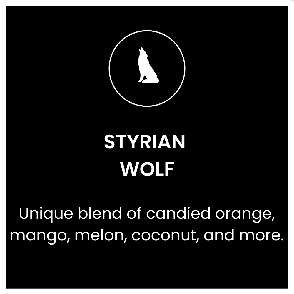 Styrian Wolf bred was at the Slovenian Institute of Hop Research and Brewing in Žalec from European and American germplasm. This variety is distinguished by its intense aroma. It is a new aroma variety with high alpha acids content. Profile descriptions include candied orange, Tang®, mango, melon, coconut, lemongrass, passionfruit, fruit punch, and pungent. Works well with all hop-forward beers, including American, Belgian, and British styles, especially modern IPAs. Styrian Wolf is similar in character to Sabro™.